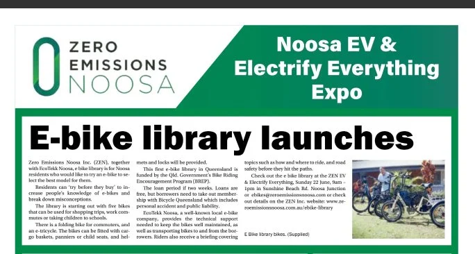Zero Emissions Noosa Inc. (ZEN), together with EcoTekk Noosa, e bike library is for Noosa residents who would like to try an e-bike to select the best model for them.